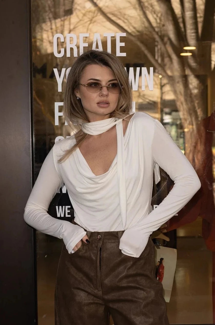 Long sleeve top with an integrated scarf made from soft stretch knit. Clean minimal silhouette...