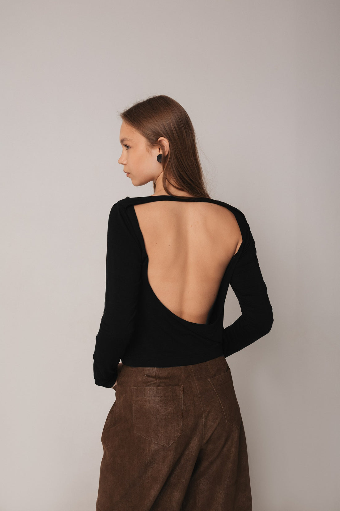 Noir long-sleeve top in soft stretch knit with an open back. Smooth, non-see-through fabric follows...