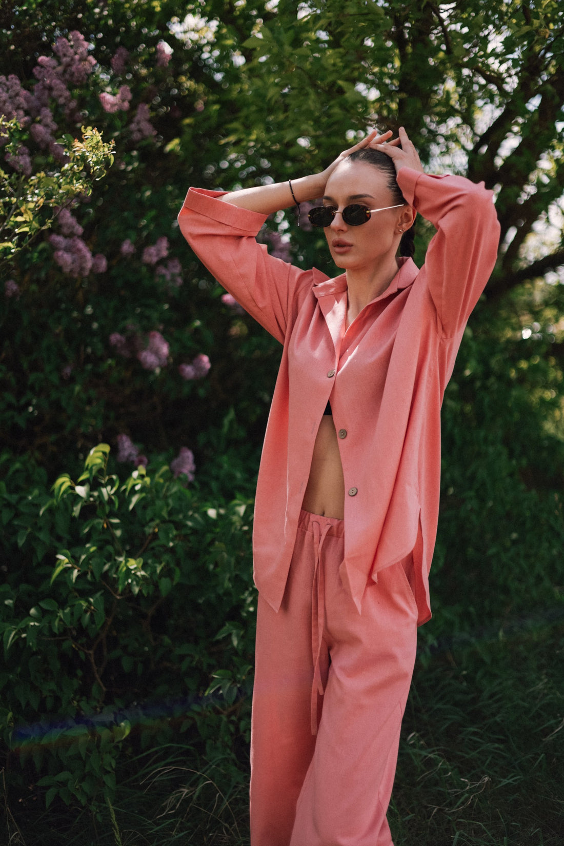 This linen-blend pantsuit combines relaxed tailoring with natural elegance. The button-up shirt features a loose,...