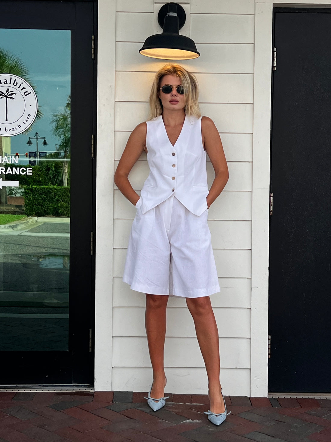 Lightweight linen suit featuring a zipped short and matching vest. A clean, modern set for...