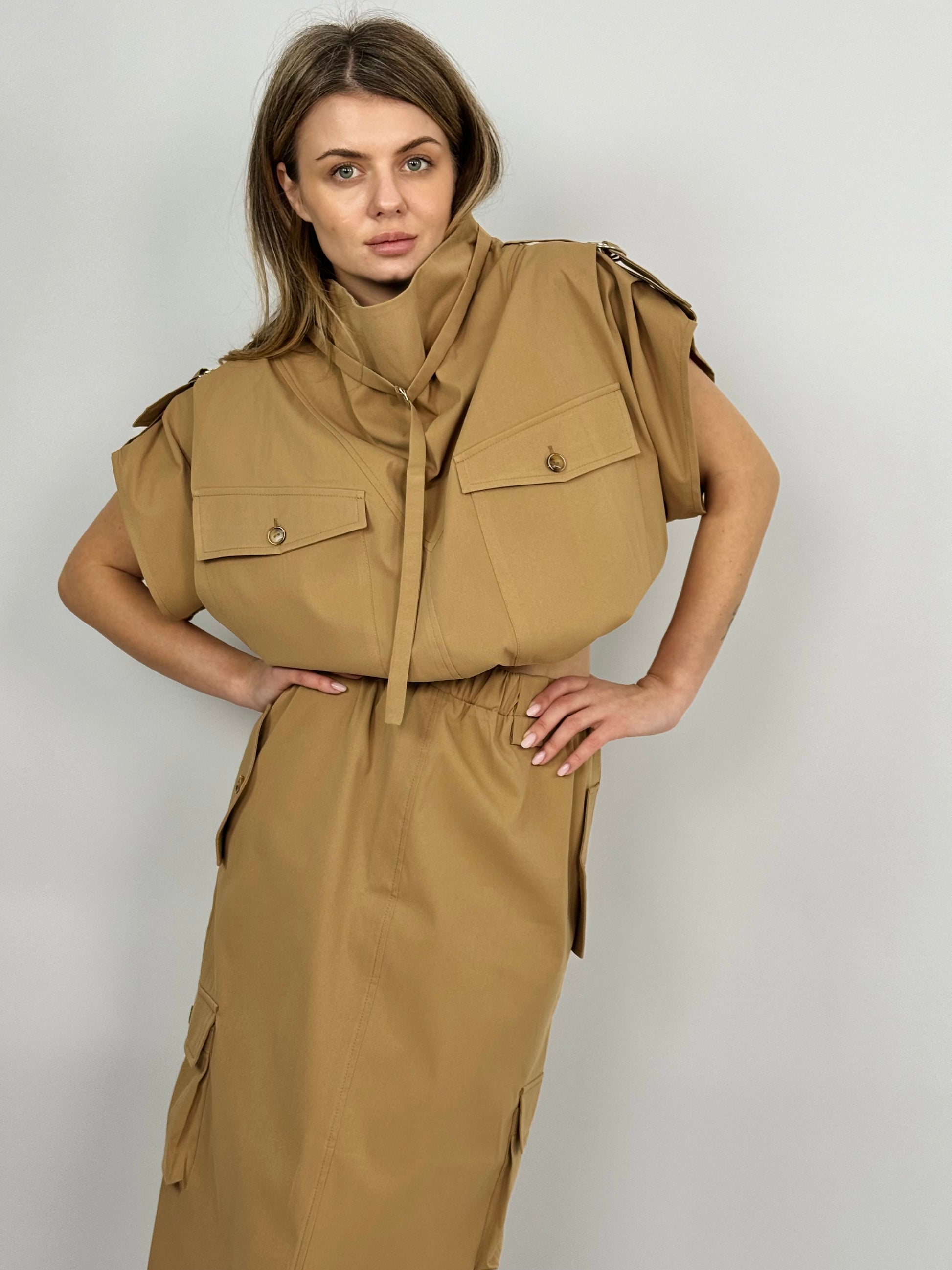 Structured cargo-style top crafted from premium cotton with distinctive utilitarian details. Featuring wide shoulders, oversized flap pockets, and a high neckline with adjustable ties, it blends a strong silhouette with modern elegance. Perfect for pairing with cargo skirts or pants for a complete look.