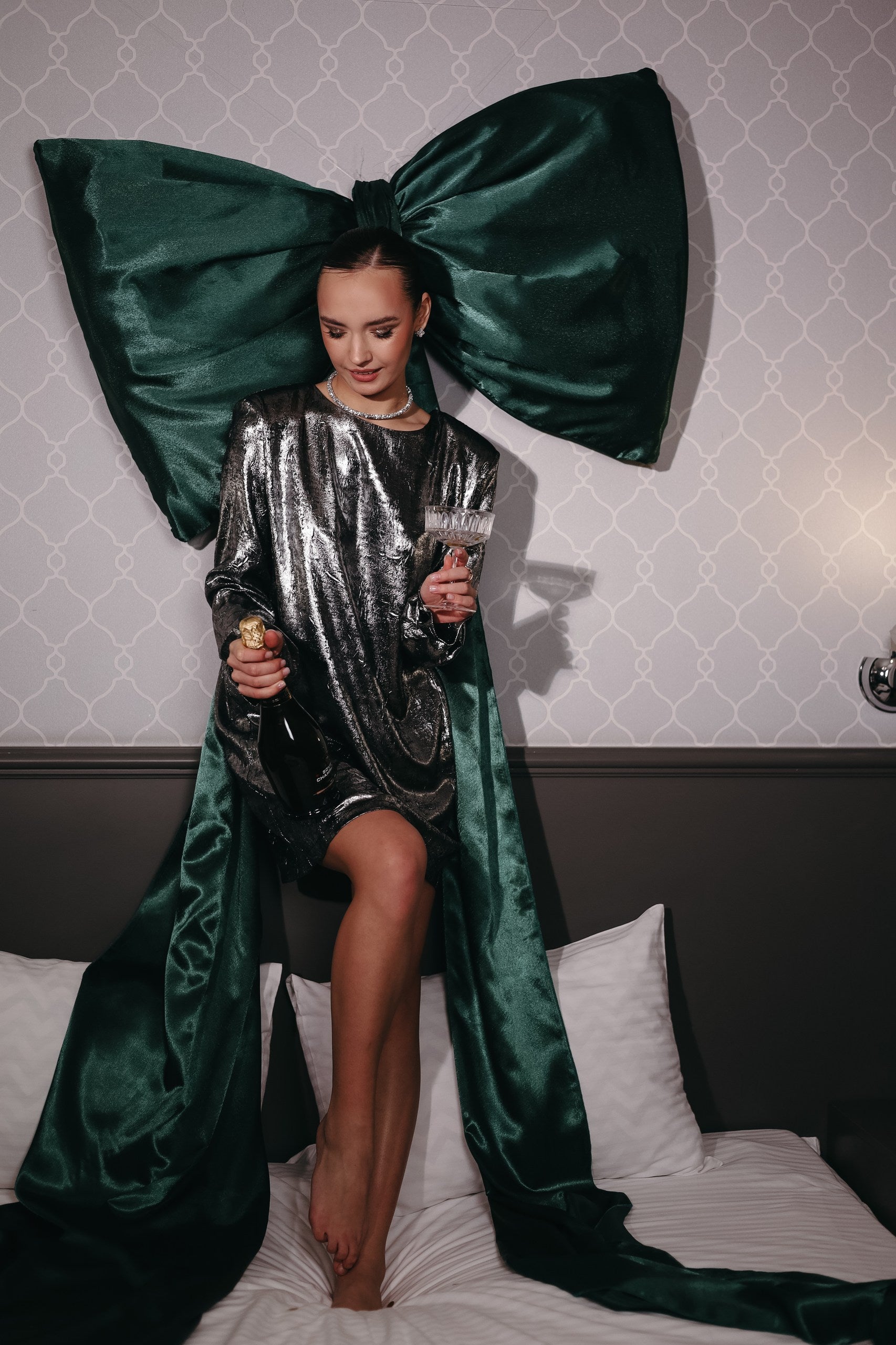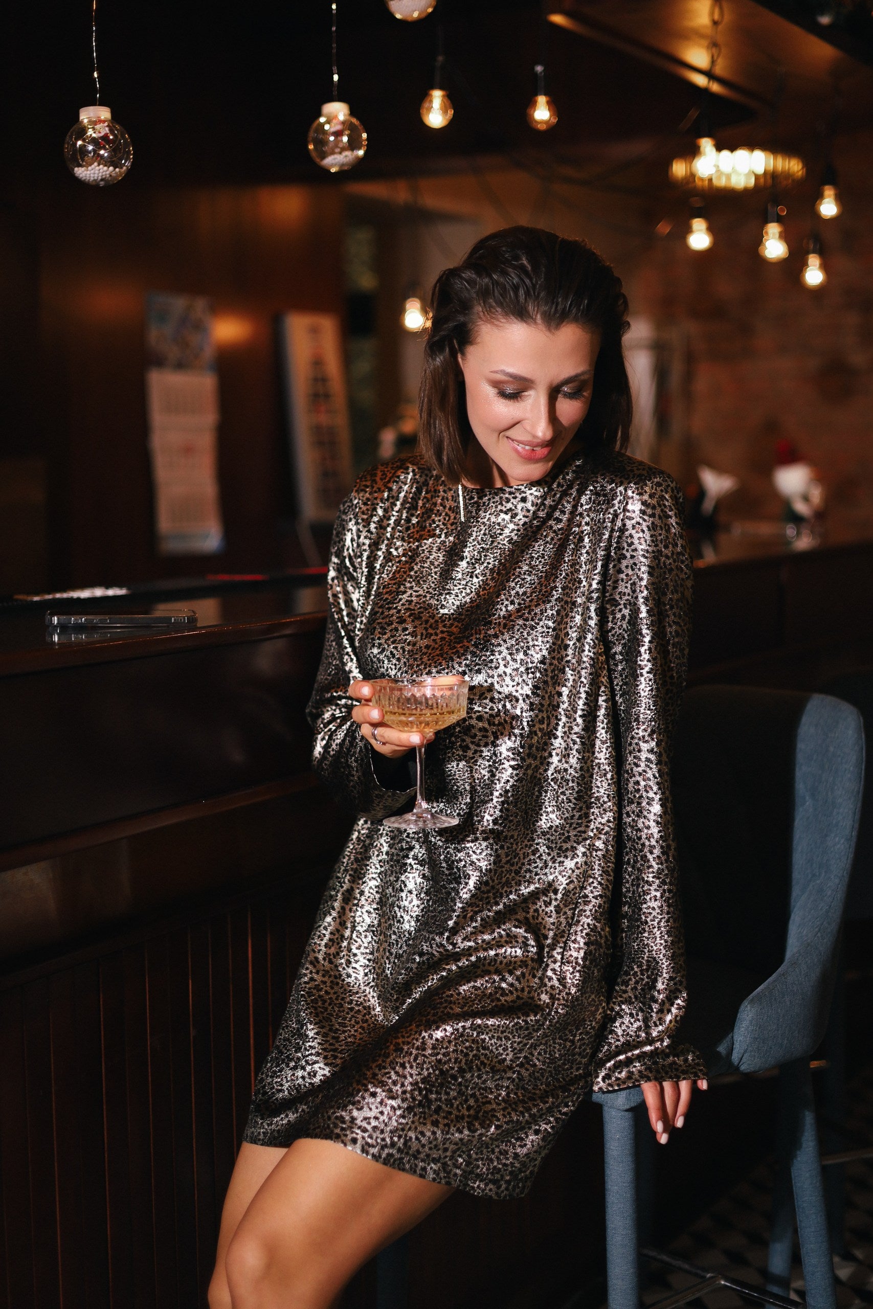 This mini sheath dress is crafted from premium lightweight polyester with a fluid, lustrous finish. The structured shoulders add refined elegance and a touch of modern sophistication, creating a polished silhouette. Designed to catch the light with every movement, this dress is perfect for evening occasions, parties, and celebrations where effortless glamour is essential.