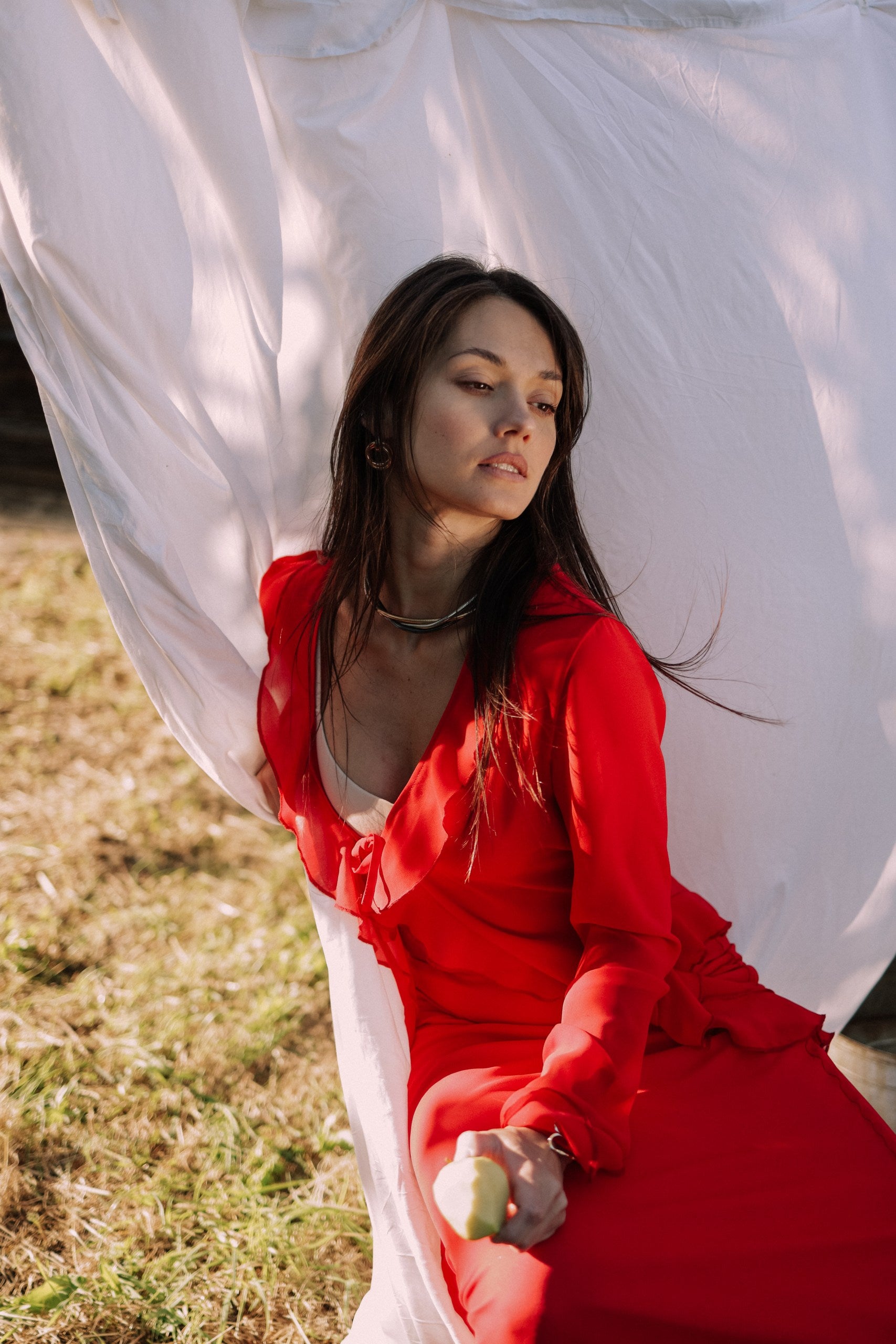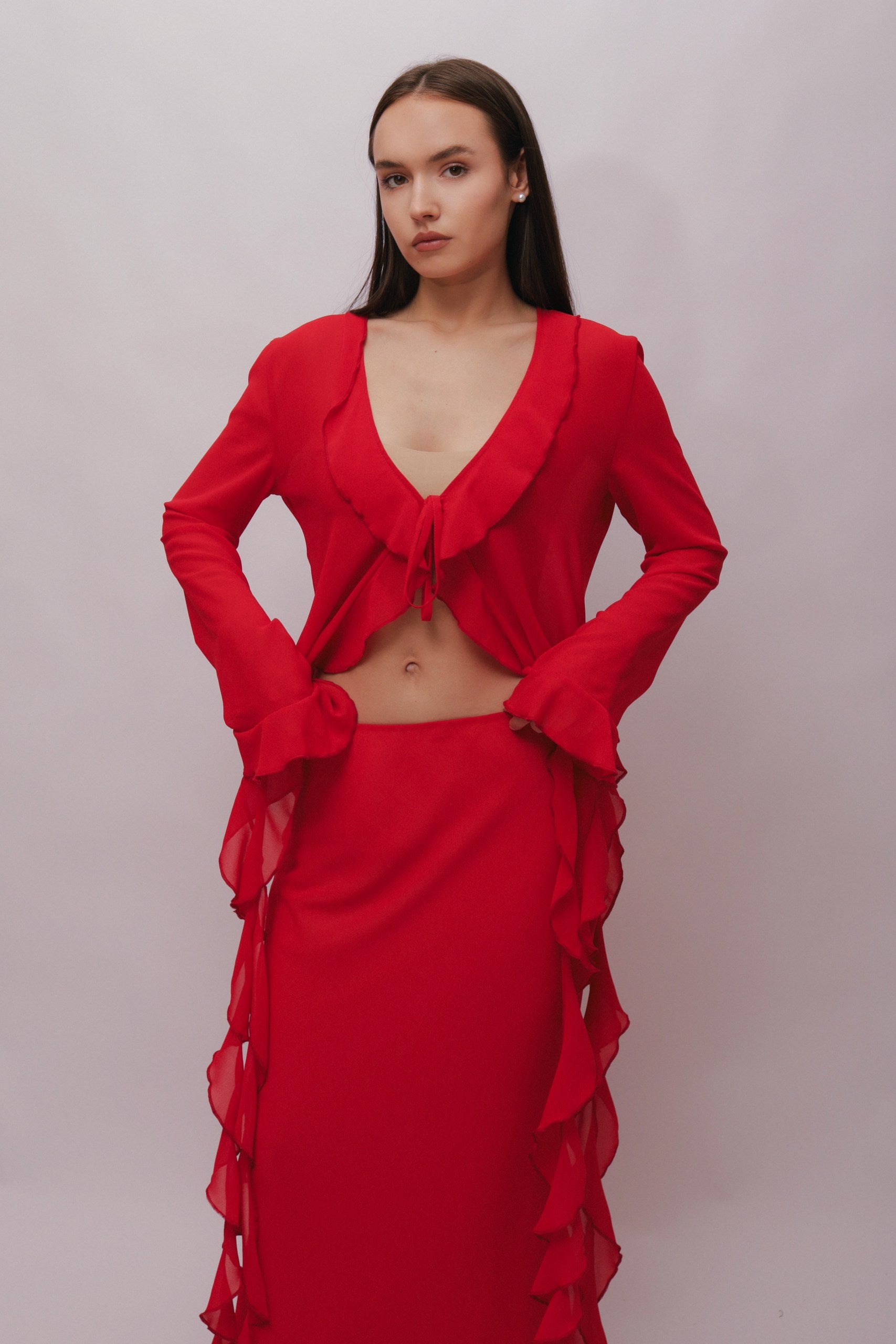 Crafted from premium chiffon, the semi-sheer texture creates a romantic silhouette, while soft draping and light ruffles highlight femininity. The skirt and top can be styled together or paired separately for versatile looks.