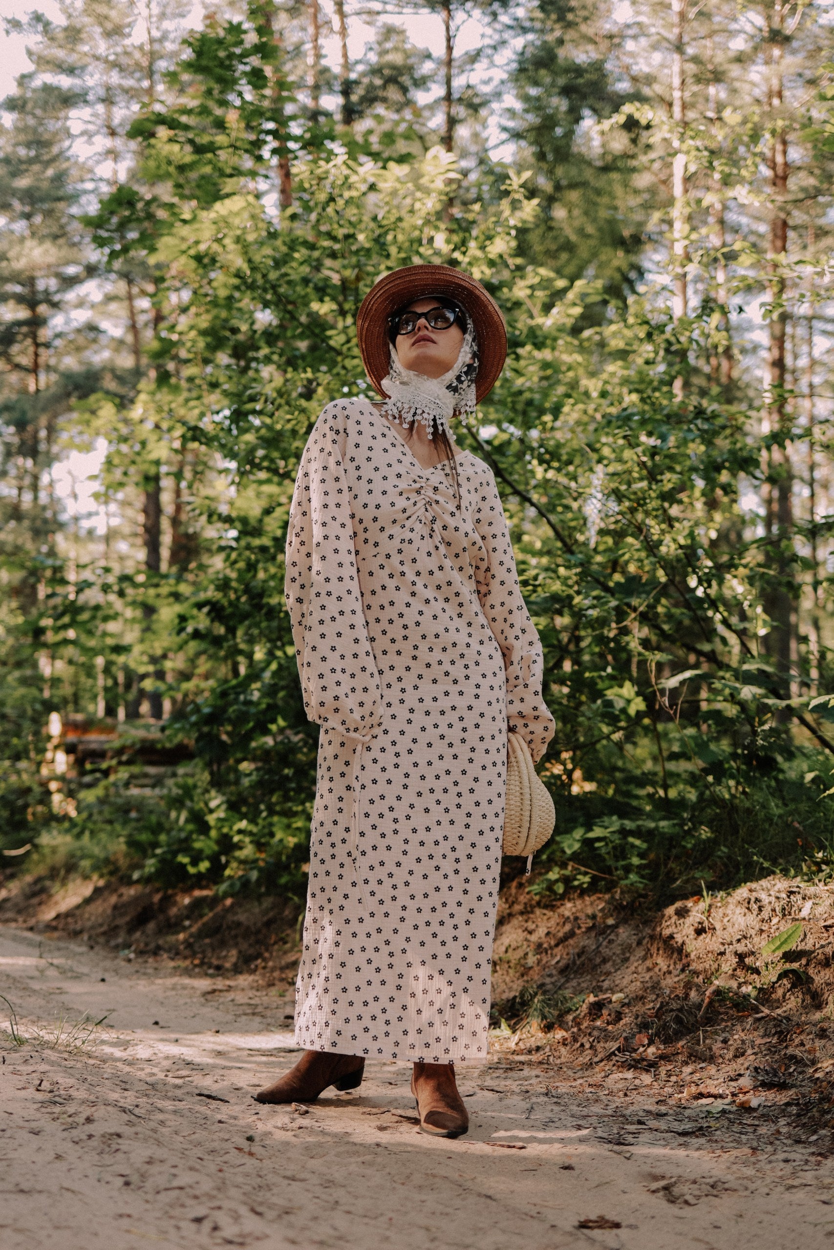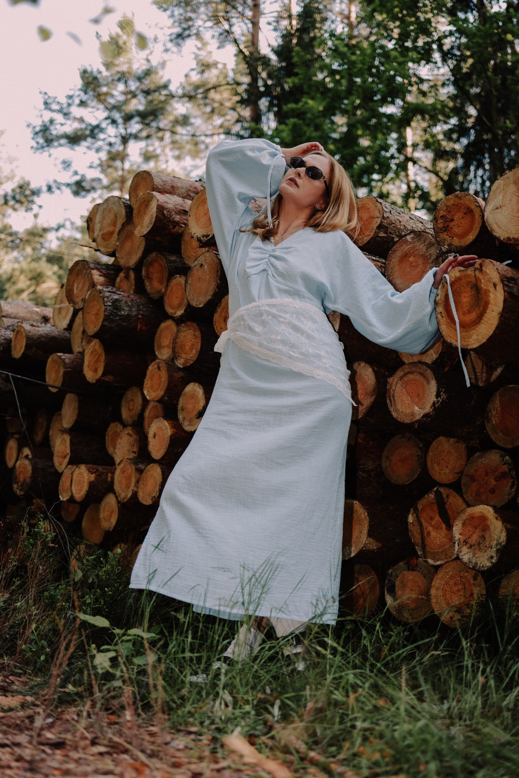 A lightweight maxi dress with balloon sleeves crafted from premium cotton muslin. The relaxed silhouette and elongated cut create an airy look, while the voluminous sleeves with tie details add a touch of femininity and character. Gentle ruching at the chest highlights the shape and gives the dress an elegant accent.