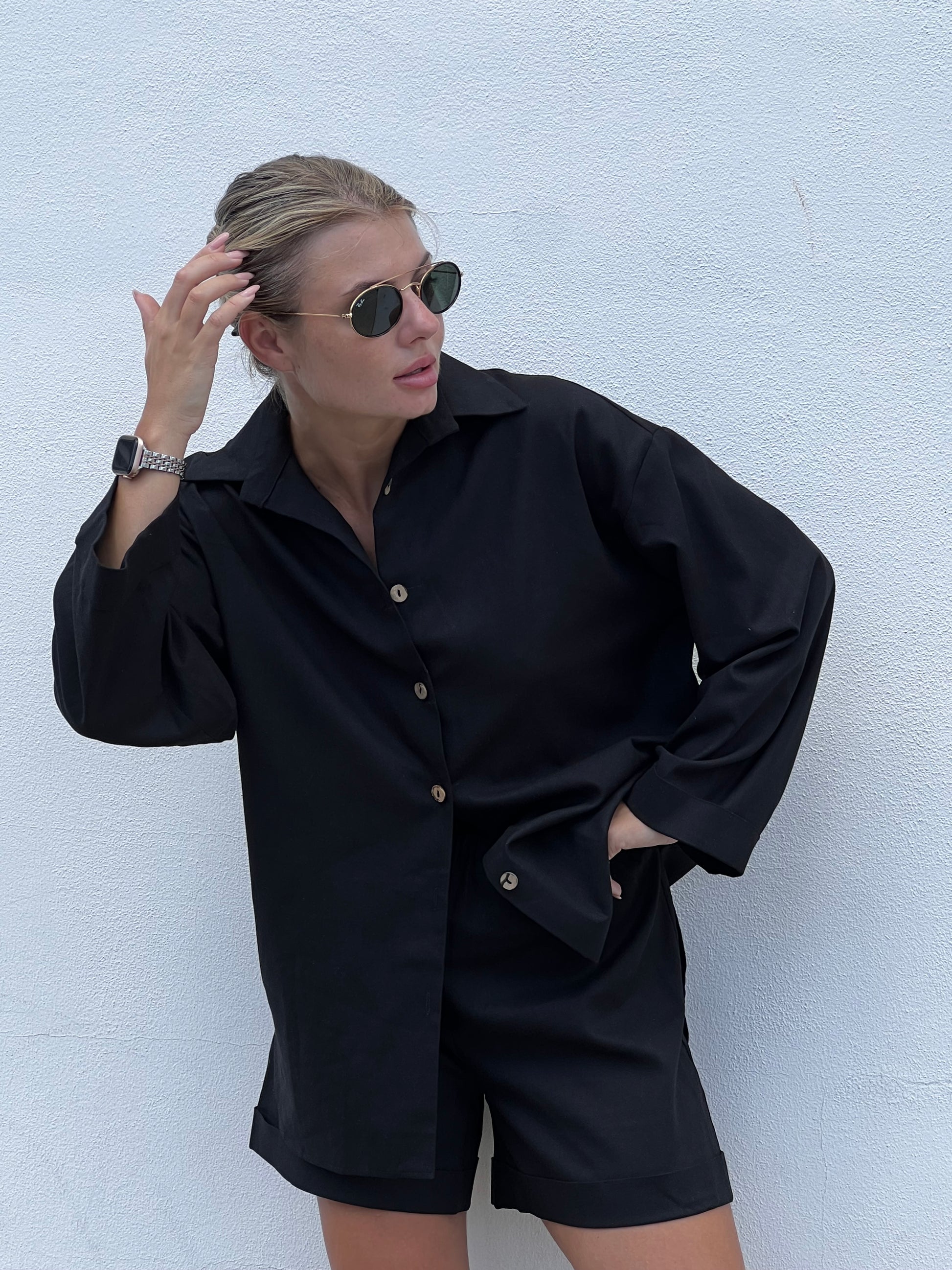 An oversized set featuring relaxed shorts and a loose-fit shirt, designed for effortless everyday style. The natural cotton-linen fabric provides comfort, breathability, and a laid-back look. Perfect for hot days, travel, or versatile mix-and-match outfits that transition seamlessly from beach to city.