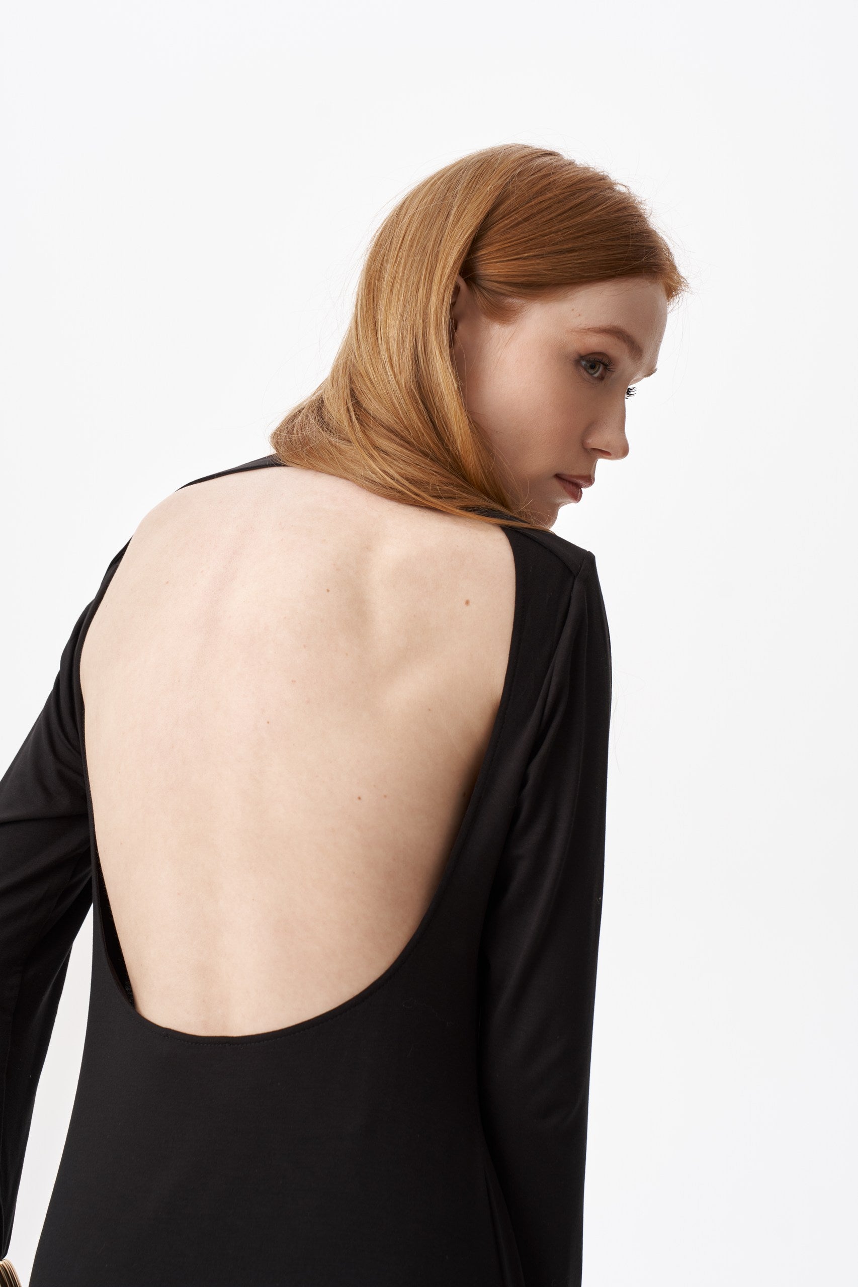 Noir mini dress in soft stretch knit with open back. Smooth, non-see-through fabric gently follows the body and fits multiple sizes thanks to high elasticity. Clean silhouette, comfortable feel — easy day-to-evening piece.