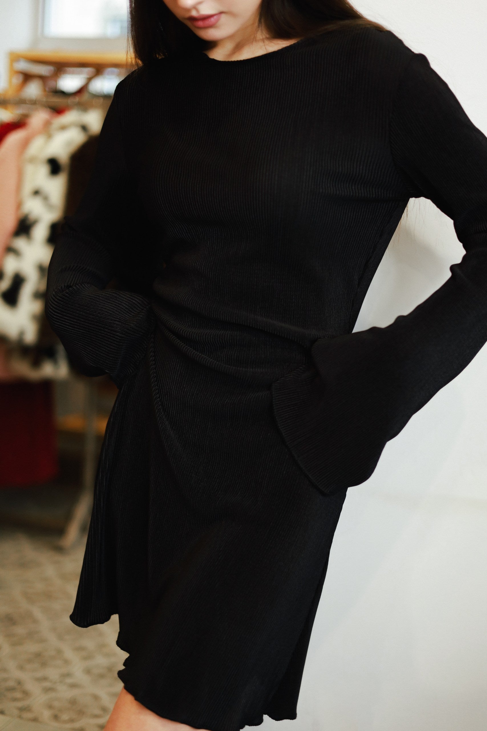 This mini dress with a silk-effect finish is crafted from high-quality premium polyester. Its delicate flared sleeves, fitted yet comfortable silhouette, and elegant shine make it a timeless piece. The dress drapes gracefully, creating a refined look without feeling tight. Perfect for evening outings, special occasions, or stylish everyday wear, it combines sophistication with ease of movement.