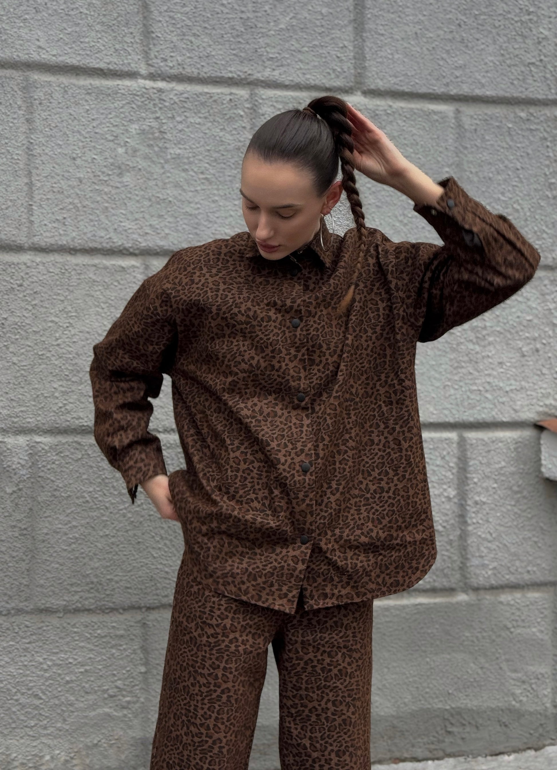 This oversized denim shirt makes a statement with a striking leopard print, blending casual comfort with wild edge.