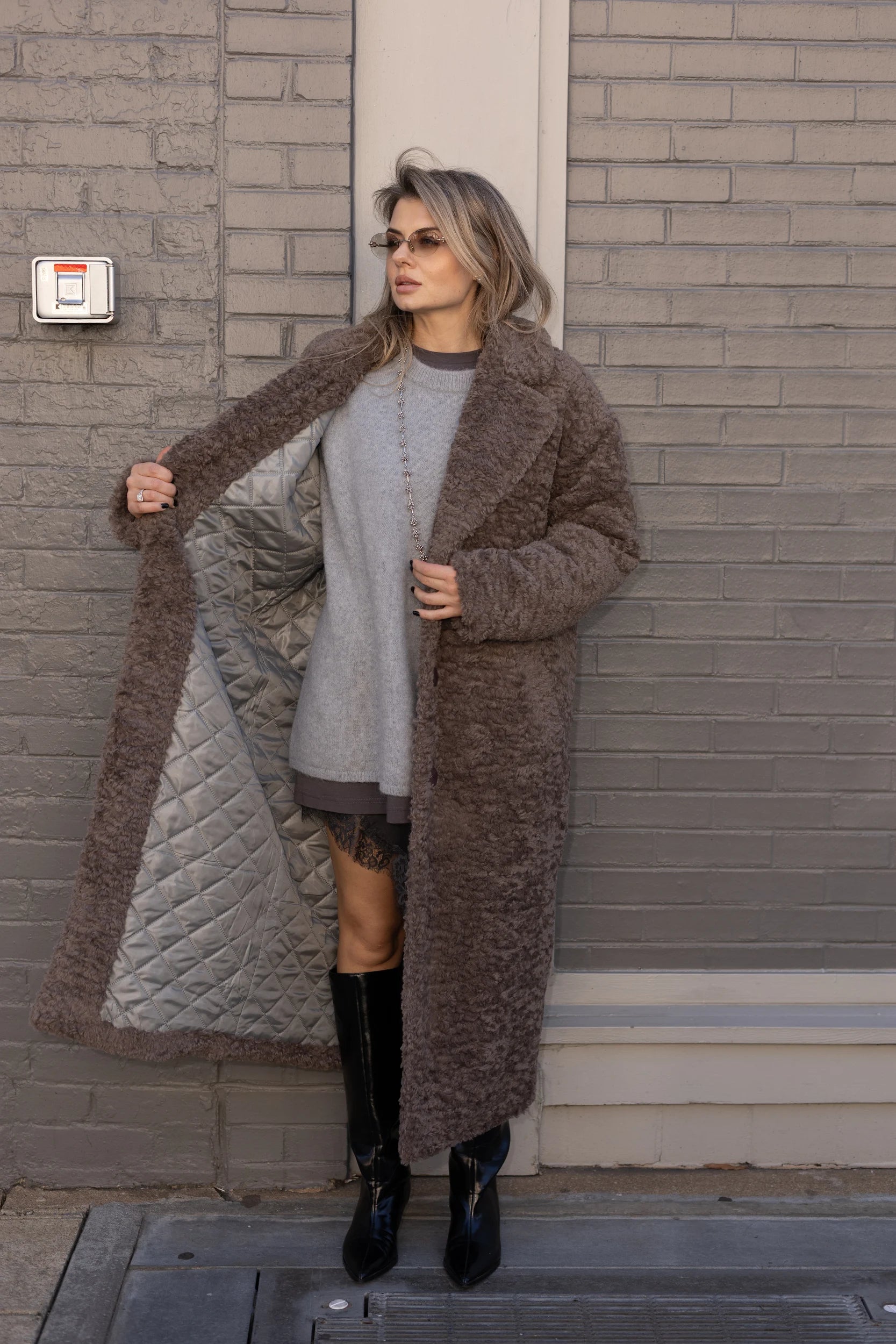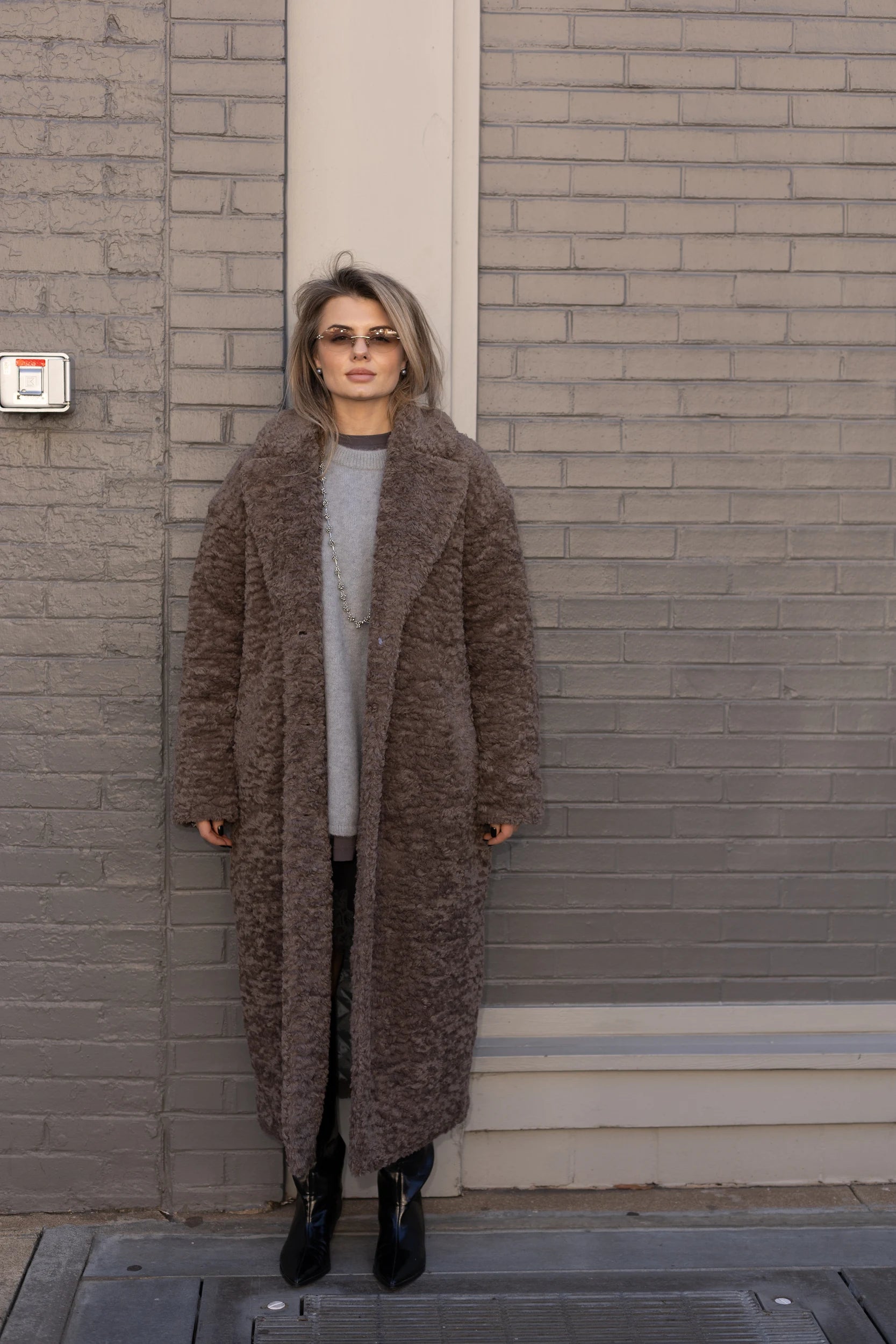 A long women’s teddy faux fur coat designed for warmth and everyday winter wear.