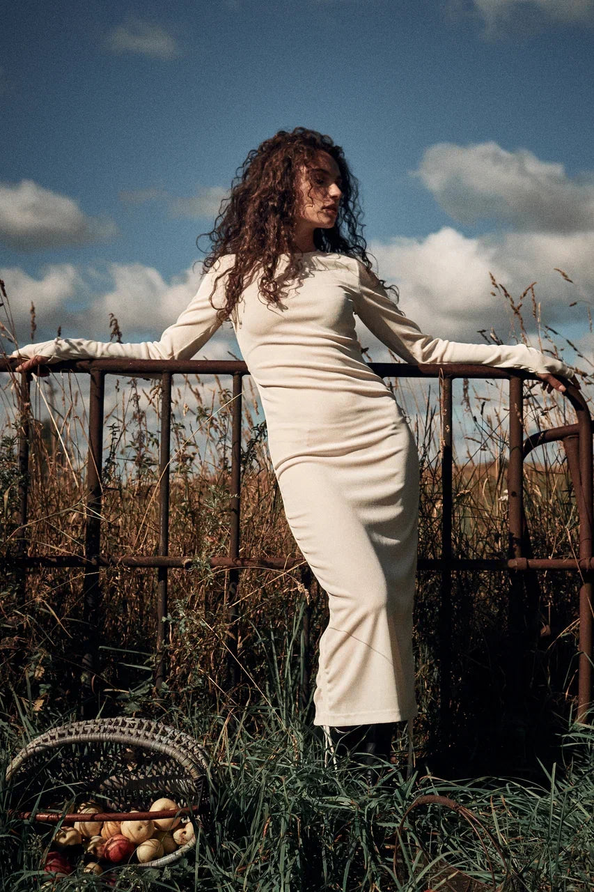 Fitted ribbed dress with adjustable drawstrings on the sides and long sleeves with thumbholes. The...