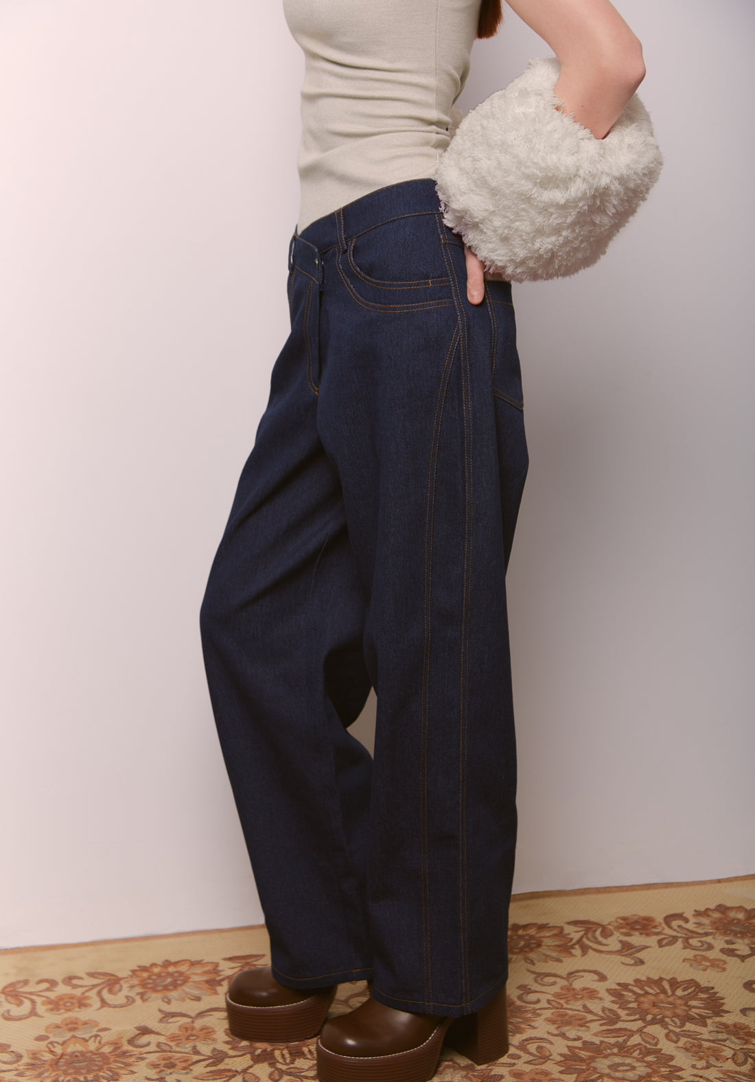Classic high-waisted jeans made from premium heavyweight denim, featuring a clean front seam that visually...