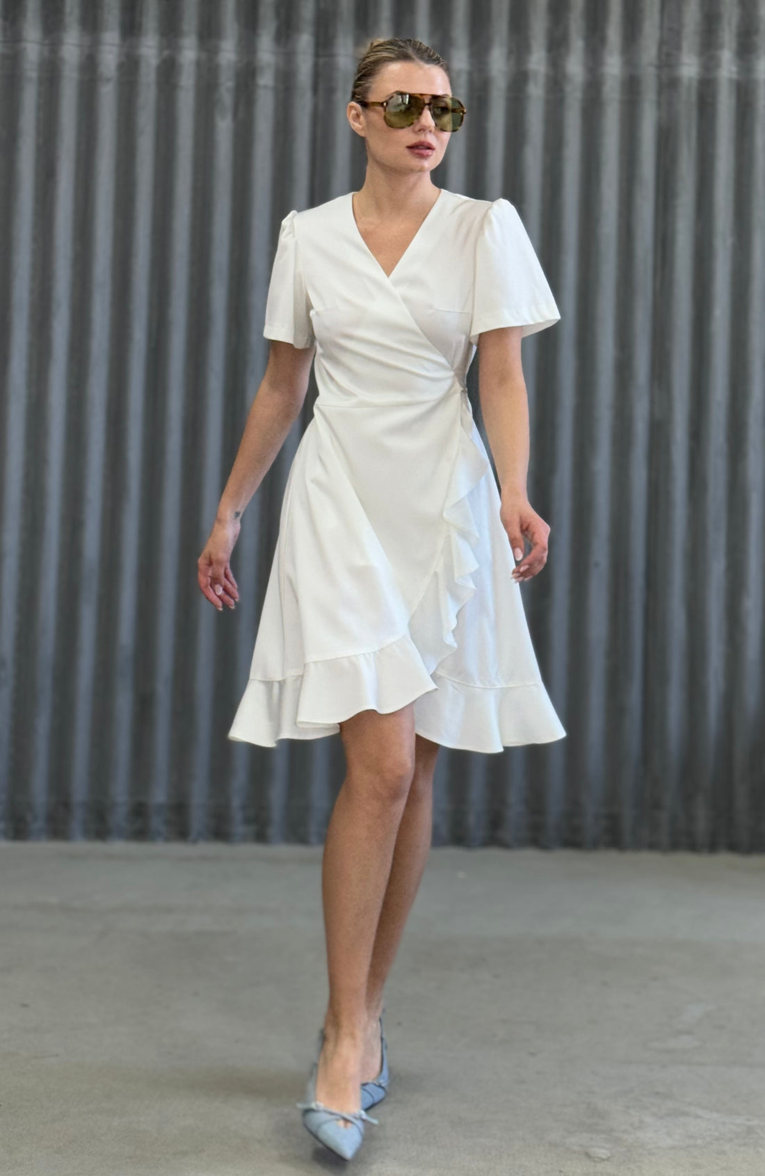 Wavy decoration of this wrap dress makes it so coquettish. Lovingly designed and produced in...