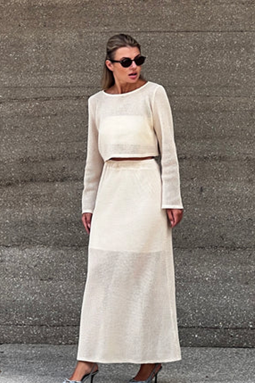 Fitted ribbed knit set with flared pants and a matching top that follows the body’s...